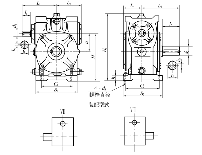 KWO蝸輪蝸桿減速機(jī)的外形、安裝尺寸和裝配型式 (mm)