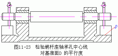 蝸桿座基準面D可用專用研具刮研,研點應為8~10/25×25mm2。檢驗軸承中心線對D面的平行度,如圖11—23所示,符合要求后裝入蝸桿,配磨調整墊片(補償環(huán)),以保證蝸桿軸線位于蝸輪的中央截面內。與此同時,徑向調整蝸桿座,達到規(guī)定的接觸斑點后,配鉆鉸蝸桿座與底座的定位銷孔,裝上定位銷,擰緊螺釘。側隙大小的檢查,通常將百分表測頭沿蝸輪齒圈切向接觸于蝸輪齒面可工作臺相應的凸面,固定蝸桿(有自鎖能力的蝸桿不需固定),搖擺工作臺(或蝸輪),百分表的讀數差即為側隙的大小。