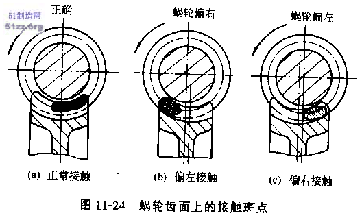 蝸輪齒面上的接觸斑點應在中部稍偏蝸桿旋出方向,如圖11—27a所示,若出現圖11—23b、圖11—23c的接觸情況,應配磨墊付片調整蝸桿位置使用權其達到正常接觸。接觸斑點長度,輕負荷時一般為齒寬的25%~50%,不符合要求時,可適當調節(jié)蝸桿座徑向位置。全負荷時接觸斑點長度最好能達到齒寬的90%以上。