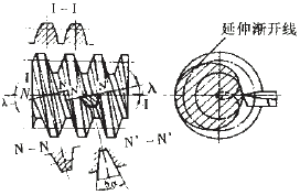 圖1所示為幾種蝸桿的車削方法,其中圖(a)、(c)所示為阿基米德(ZA)蝸桿和漸開線(ZI)蝸桿。當蝸桿的頭數(shù)增多、導程角增大時,其幾何形狀和切削角度將出現(xiàn)加工困難。圖(b)所示為一種延伸漸開線蝸桿,又稱齒槽法向直廓(ZN