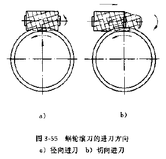 切制蝸輪時,有兩種進刀方法,徑向進刀法和切向進刀法,見圖3-55。